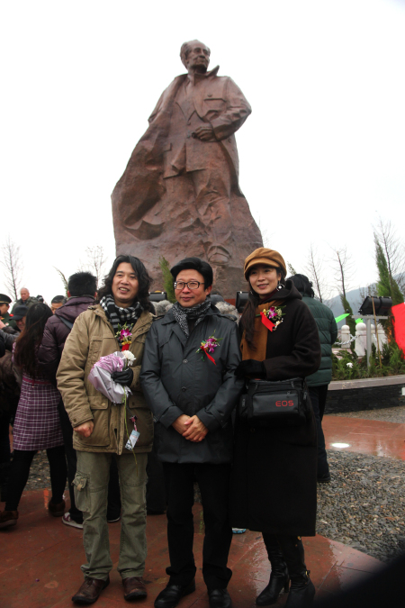 原大陳鎮(zhèn)黨委孫書記和雕塑家東郭教授(左)及其夫人張莉(右)在胡耀邦雕像前合影