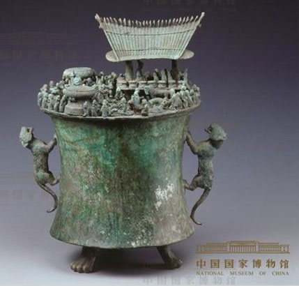有一件貯貝器表現(xiàn)的是殺人祭祀的詛盟場面:廣場上陳列著大銅鼓,人頭洶涌,作為祭祀的奴隸被捆住,在柱子上盤繞的巨蛇即將吞噬他,神氣活現(xiàn)的女奴隸主坐在轎子上已經(jīng)駕臨,祭祀即將開始。