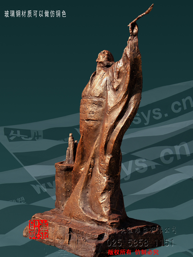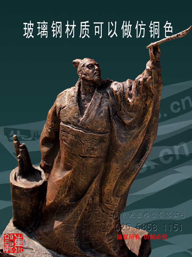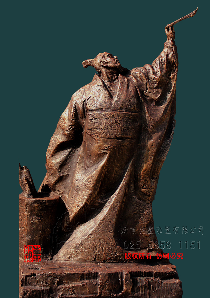 張芝字伯英,出生官宦之家,幼時(shí)高操,勤習(xí)學(xué)書(shū),朝廷賞識(shí),令他做官,而他并非貪圖高官厚祿,甘做布衣。素日臨池學(xué)書(shū),得崔杜之法,復(fù)而變之,遂成“今草”。張芝對(duì)書(shū)藝癡醉令人驚嘆。衛(wèi)恒《四體書(shū)勢(shì)》里有言“凡家之衣帛,必先書(shū)而后練之。臨池學(xué)書(shū),池水盡墨。”張芝對(duì)于書(shū)法藝術(shù)的不斷索求,終成一代“草圣”,當(dāng)是“為世所寶,寸紙不遺”。雕塑里張芝如平日習(xí)作,但見(jiàn)他揚(yáng)手,握管,在虛空中縱姿揮毫,一如其書(shū)法,一筆而就,不拖沓凝滯,衣袍素袖宛如字之體勢(shì)婉轉(zhuǎn)流暢,舒箋觀(guān)鳥(niǎo)跡,研墨染魚(yú)緇。