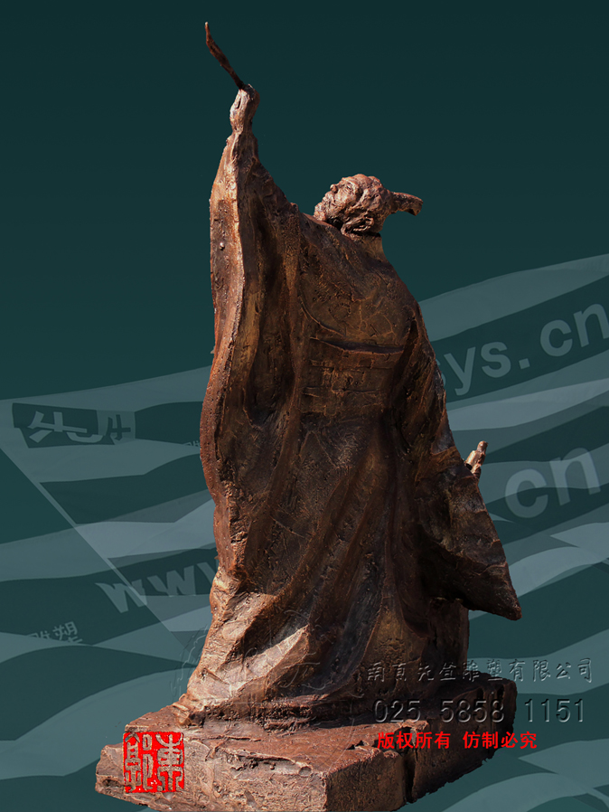 雕塑作有與無(wú),寫(xiě)色表現(xiàn)空,以物質(zhì)的有表現(xiàn)無(wú)與息,是有“天風(fēng)浪浪,海山蒼蒼。真力彌滿(mǎn),萬(wàn)象在旁”。雕塑里頭,人物形體概況詳實(shí),清癯的面容,碩長(zhǎng)的身姿,著一襲衣衫浮動(dòng),自是風(fēng)清日里吞吐大荒,真境逼而神境生,滿(mǎn)目里卻皆是山蒼木秀,水活石潤(rùn),大自然的生息。再者看張芝揚(yáng)手舉面,凌空中書(shū)寫(xiě),筆在而帛錦無(wú),筆墨有無(wú)間,取大自然造化,吸盡西江,一筆當(dāng)空書(shū)長(zhǎng)卷。寫(xiě)盡的是人事浮華,寫(xiě)山河秀麗,寫(xiě)日居月諸,寫(xiě)去到日月山川里。寫(xiě)盡了生命的飛揚(yáng)與物的安定。